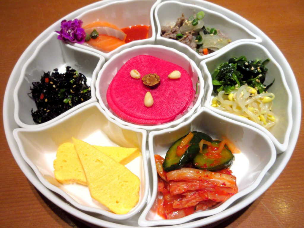 キムチ、卵焼き、岩ノリやサーモン、プルコギ、青菜ともやしのナムル、