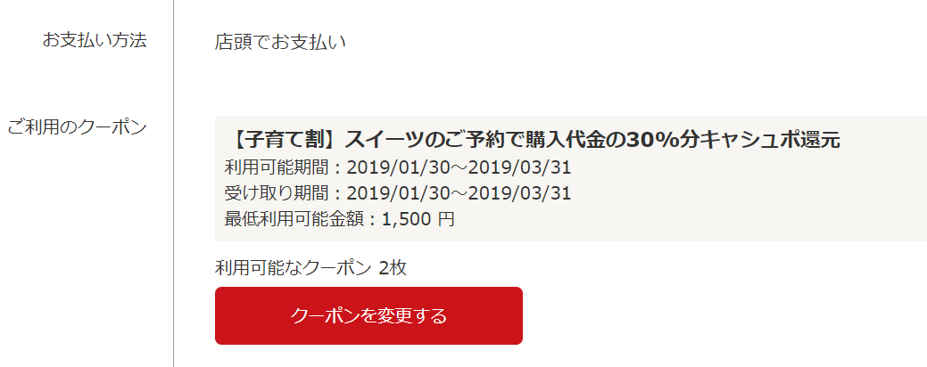 3、 子育て割の スイーツ 30% 引きと書いてあるところ 見つけ、クーポンを手に入れる