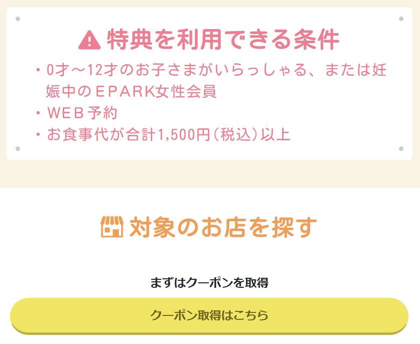 上記のような、子育て割の特典バナーを見つけ、進むと、