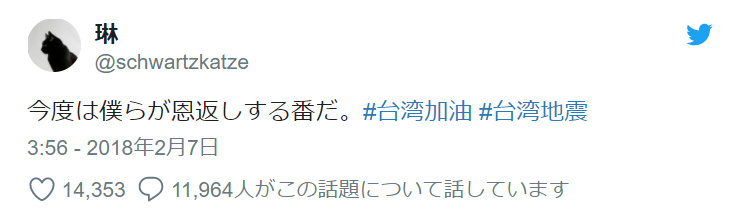 twitterのハッシュタグ、「#台湾加油」(台湾頑張れ)は、トレンドの1位に。