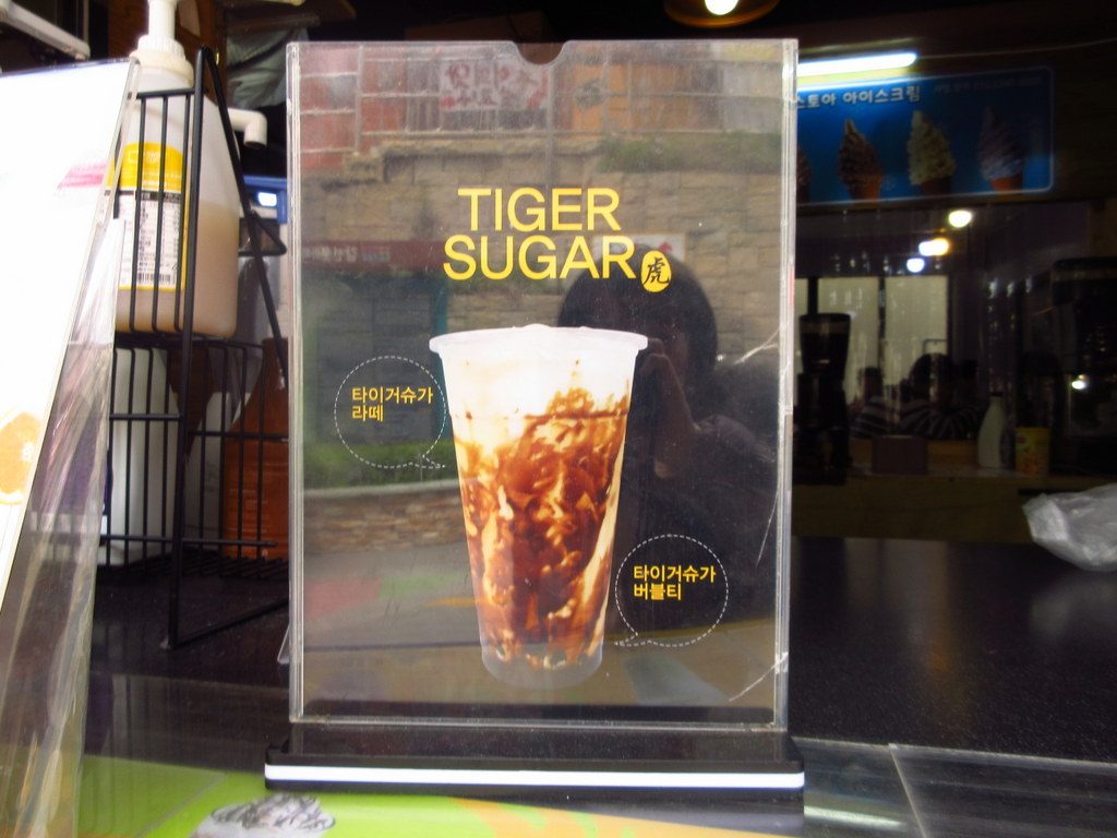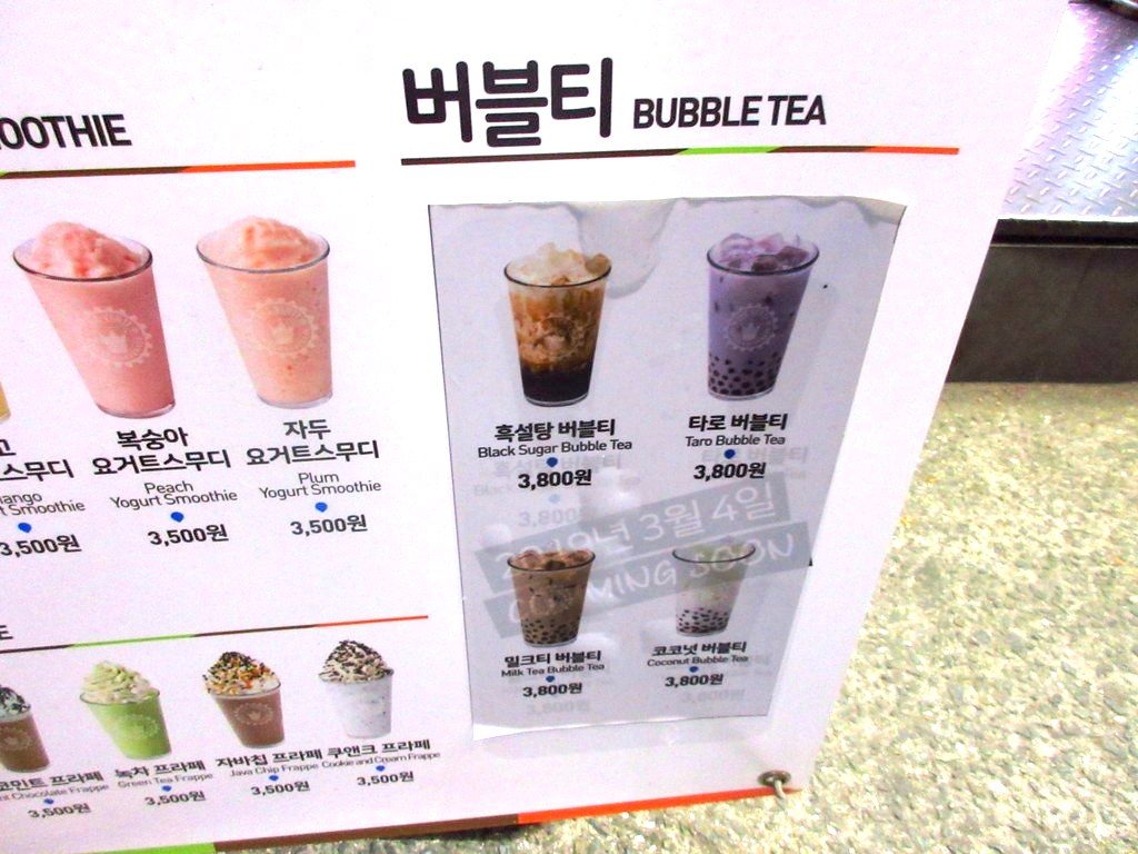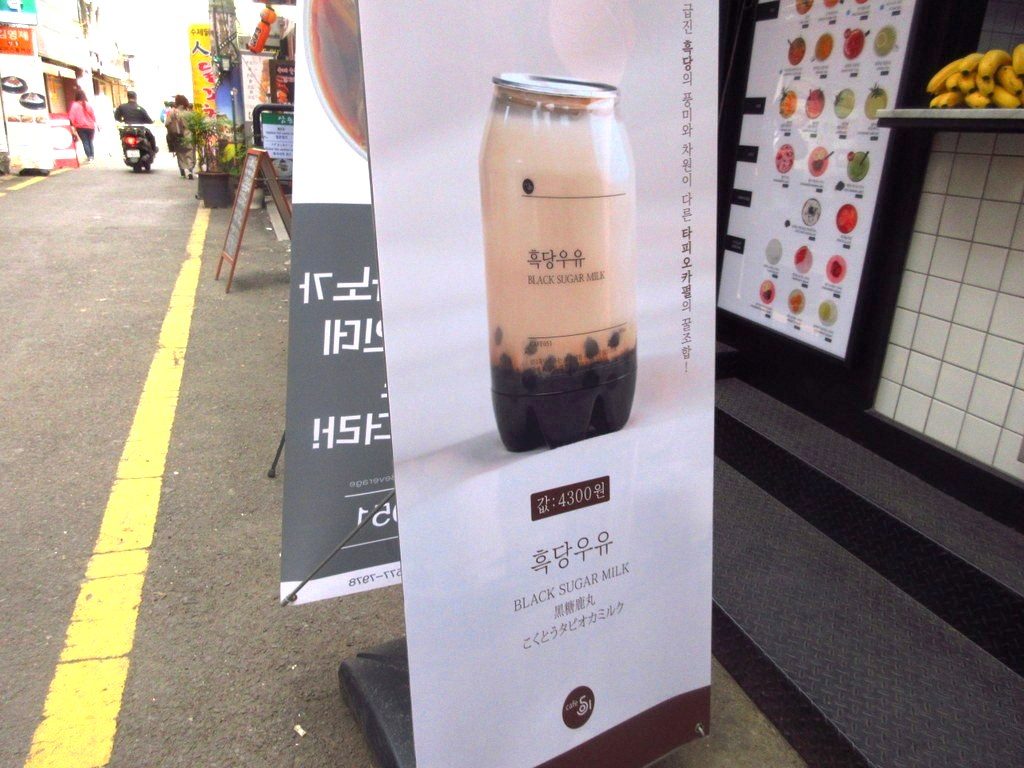 韓国では黒糖タピオカミルクのメニューの置いてあるティースタンドの方が多かったです。韓国では紅茶を入れないタピオカ黒糖ミルクが流行っているのかな?