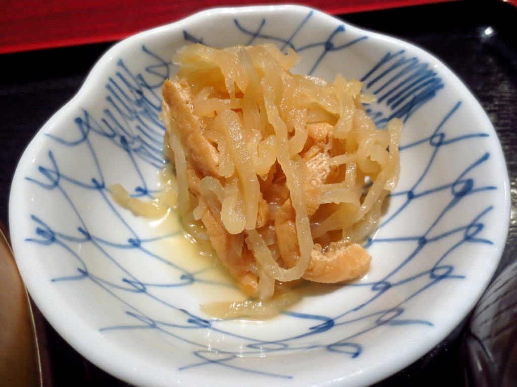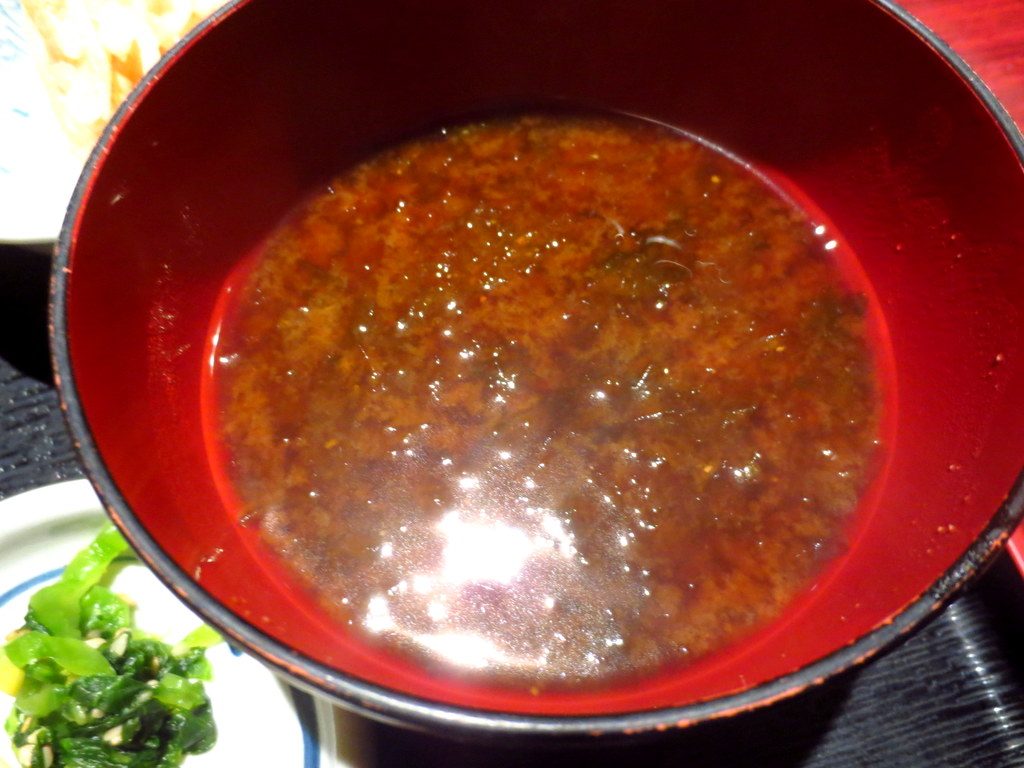 小鉢は切り干し大根の煮物で、赤だしのお味噌汁にはアオサが入っていました。