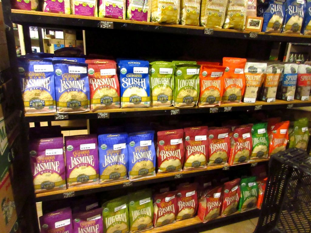 お米コーナー。ジャスミン米、バスマティ米、SUSHI米(ジャポニカ米?!)など多品種あります!