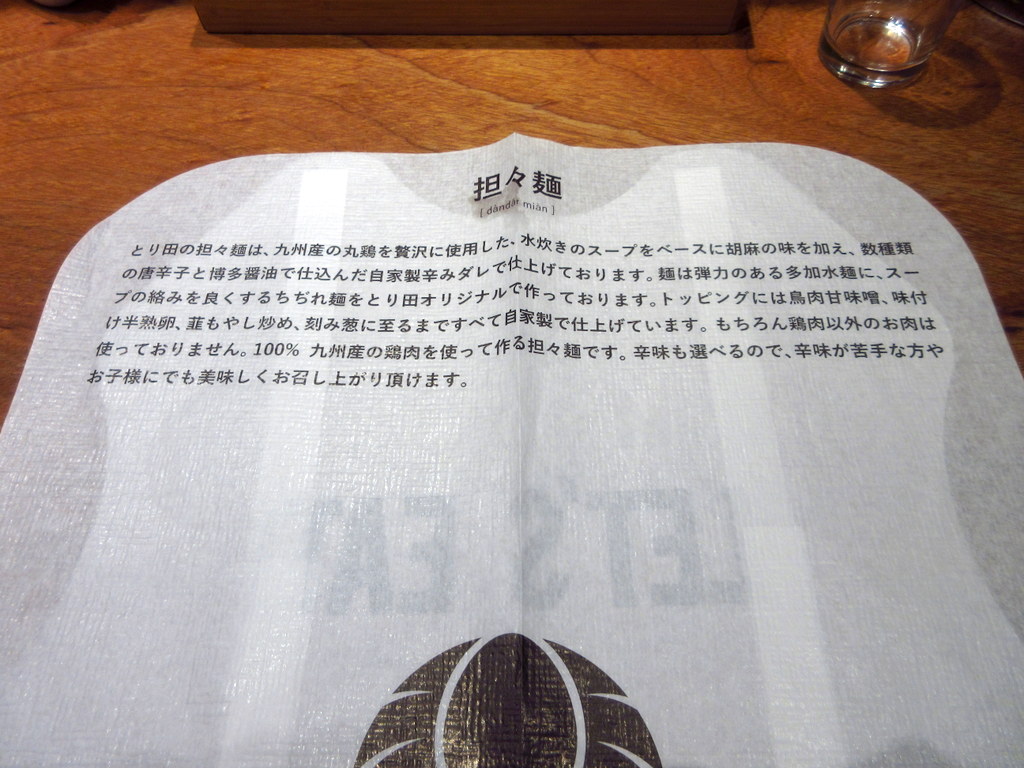 カウンターには担々麺の説明が書いてある紙エプロン付き。