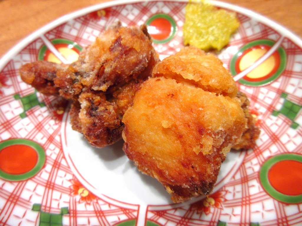 唐揚げは胸肉と鶏肉が一個ずつ、黄色いペーストはニンニクではなくて