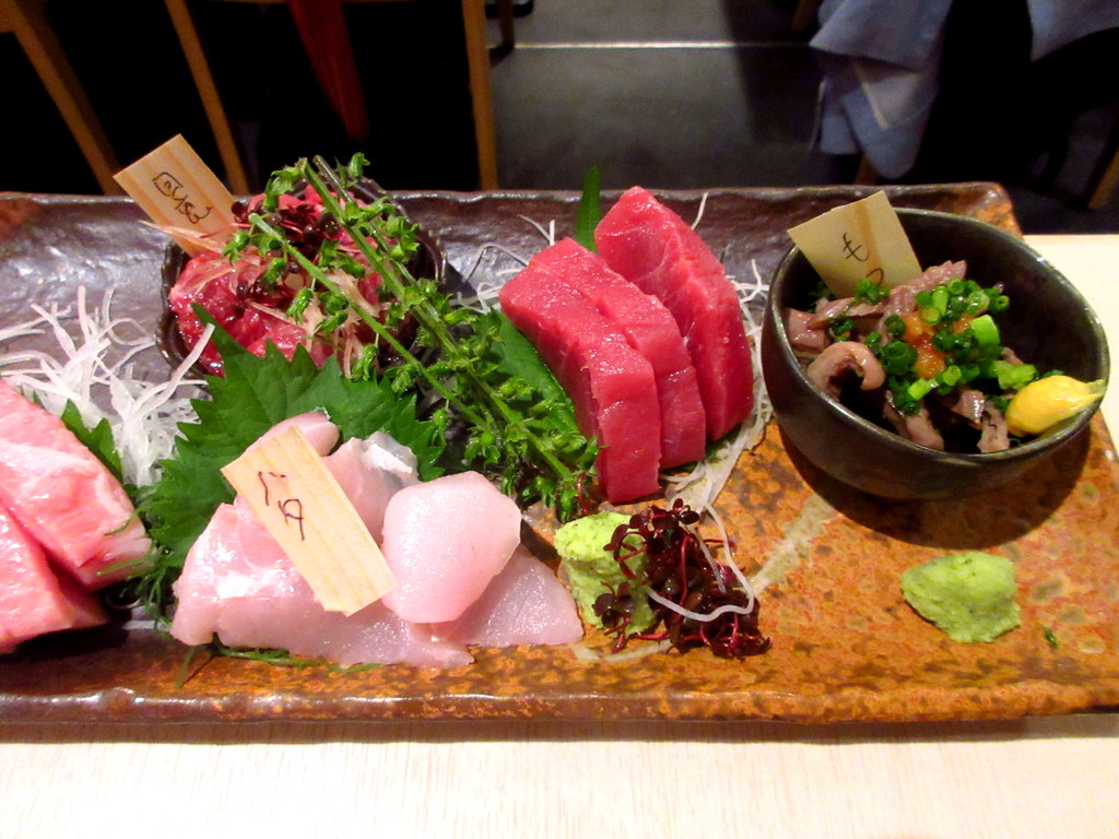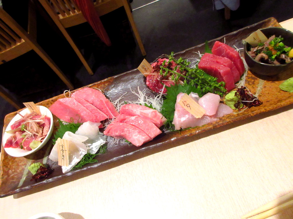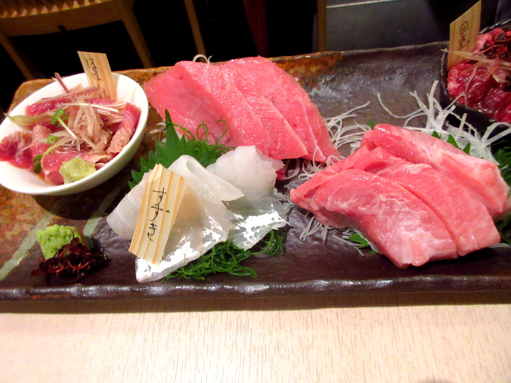 ↑マグロの頬肉のたたき、 スズキの刺身、マグロの中トロ、