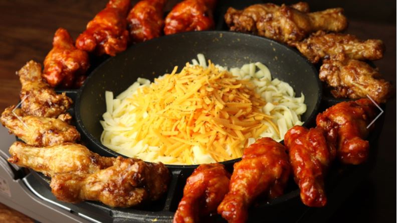 周りのチキンをチーズに絡めながらいただく韓国風のチーズフォンデュ・・・