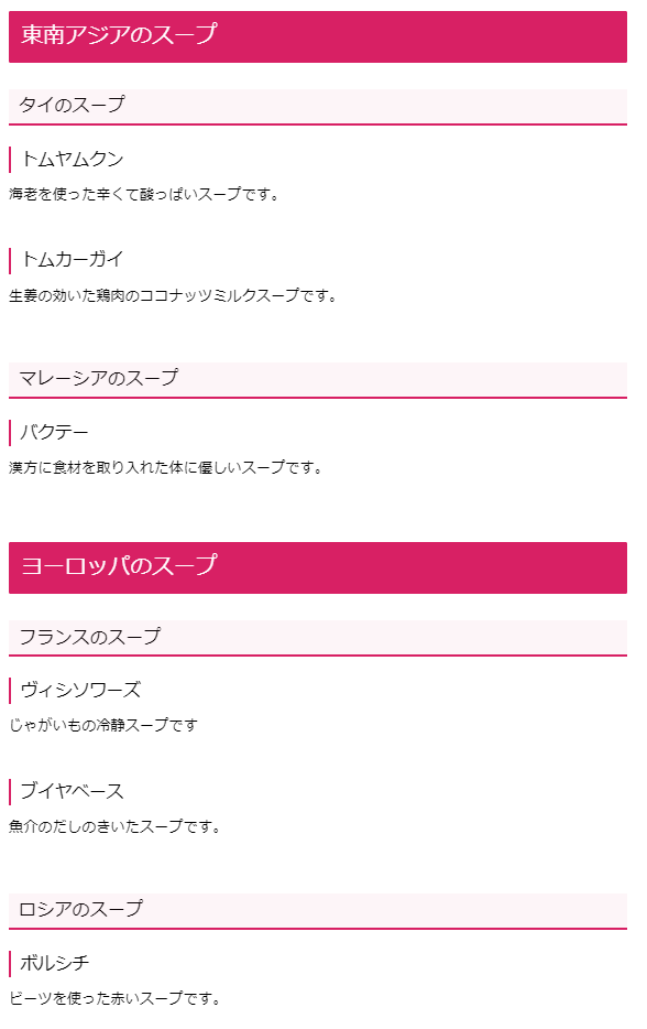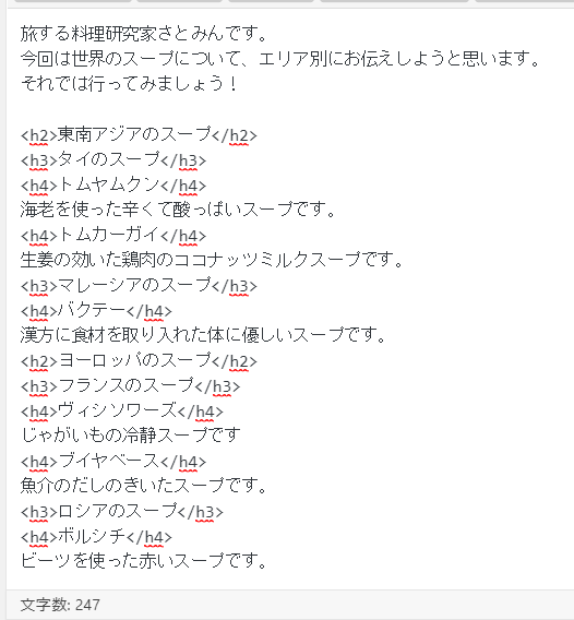 「見出し3」は具体的な国名+スープ、「見出し4」は具体的なその国のスープの名前というように、数字が大きくなればなるほど、そのカテゴリにおいて細分化されて具体的になってきます。