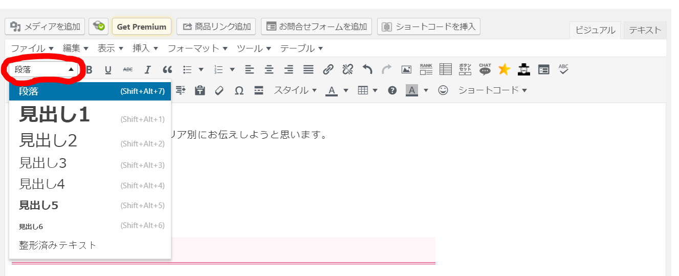 ビジュアルモードでは「見出し〇(〇は数字)」、