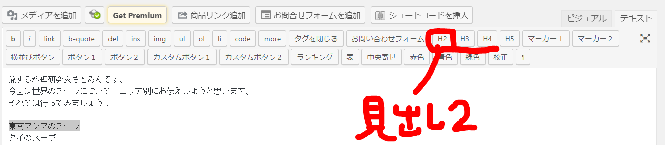 見出し2の場合は h2のボタンを押します。