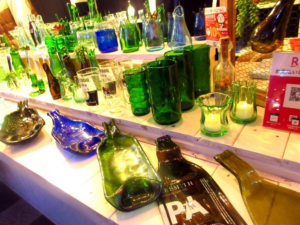 空瓶を再利用してグラスやお皿にしているのですが、これがすごく可愛い!