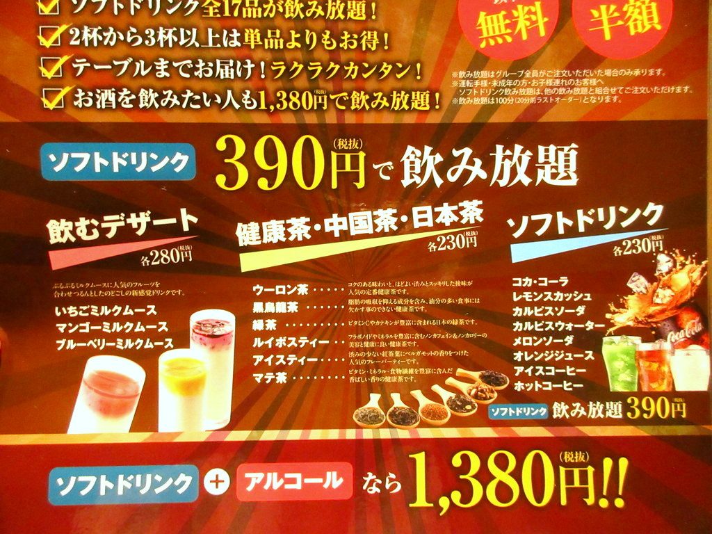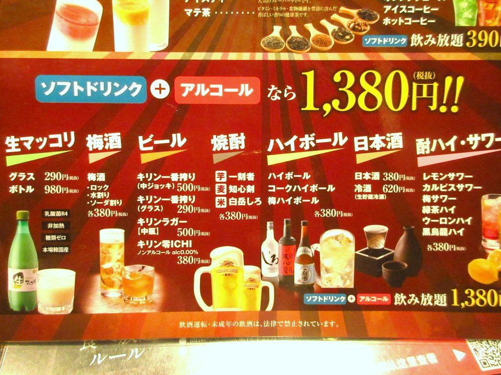 アルコールをつけたい場合は税抜き1380円で飲み放題になります。