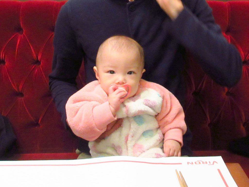 ↑大人の場に参加する0歳児(次期社長?)あかりん。